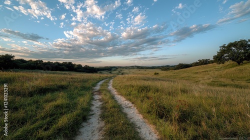 Country road sunset, grassy field, Texas landscape, pastoral scene, nature photography