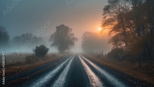 Country road surrounded by fog and sunrise - serene autumn morning in a rural setting
