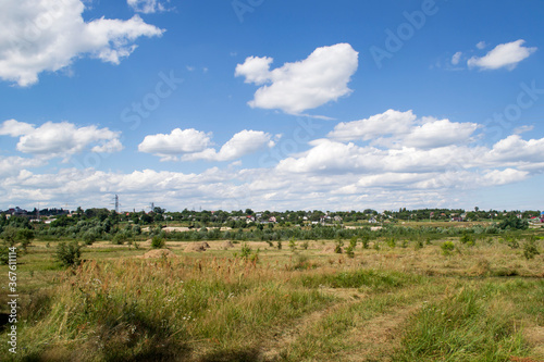 Countryside landscape with blue sky and white clouds.