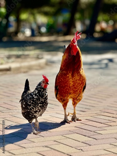 park, feather, chicken, rooster, bird, farm, animal, hen, poultry, cockerel, agriculture, fowl, nature, white, isolated, feather, red, beak, domestic, farm animal, rural, green, animal, free, black, grass, couple