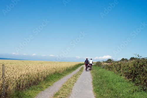 bornholm, denmark, scandinavia, europa, color image, horizontal, copy space, two people, people, couple, outdoors, daytime, cloud, bicycle, bicyclist, leisure, recreation, riding, bicycling, road, crop, agriculture, rural scene, field, cropland