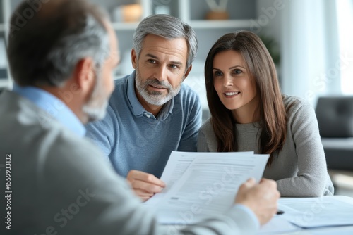 couple, sitting, desk, reviewing, mortgage, loan, document, discussion, financial, adviser, paperwork, consultation, agreements, home, purchase, planning, teamwork, communication, human relationships, serious, professionalism, clarity, trust, sharpened, investment, office, workspace, interior, bright, light, furniture, engagement, conversation, support, guidance, male, female, client, assistance, decision-making, explanation