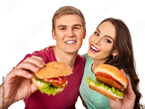 Couple eating fast food. Man and woman eat hamburger with ham. Friends holding two burder junk on white background isolated. Loving couple prefers fast food to homemade dinner. Discounts for fast food