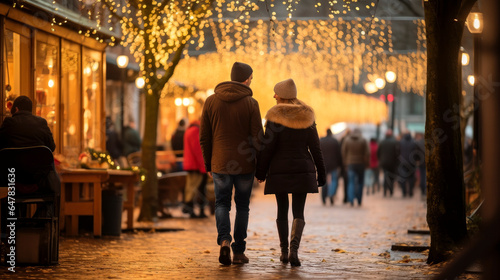 couple enjoying and taking a stroll in a traditional christmas market - christmas markets concept
