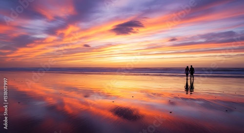 beach, sunset, couple, silhouette, ocean, sky, sea, horizon, romantic, golden hour, travel, landscape, nature, evening, orange, purple, cloudscape, coastline, water, shore, peaceful, serene, tranquil, vacation, travel destination, scenic, realistic, photo, sunrise, people, walking, summer, cloud