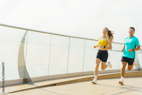 couple, jog, waterfront, path, morning, exercise, sunny, fitness, running, activity, health, leisure, lifestyle, sport, sea, board, smile, nature, summer, fresh air, harmonious, joyful, athletic, friendship, scenery, sunlight, vitality, movement, scenic, coastline, togetherness, enjoyment, warm, motivation, physical exercise, pavement, bright, running shoe