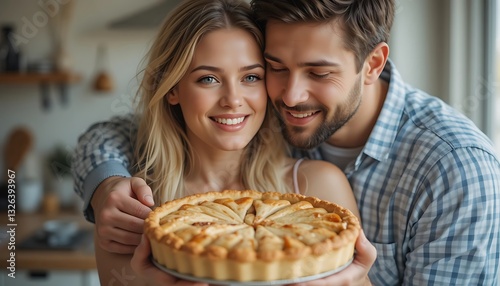 couple, pie, holding, smiling, woman, man, looking, homemade, together, sharing, loving, celebrate, family, indoor, kitchen, portrait, closeness, hugs, cheerful, happiness, positive, human relationships, affection, light, casual attire, baked, cooking, preparing, lifestyle, food, sweet, delicious, celebration, home, fresh, young adult, enjoying, domestic
