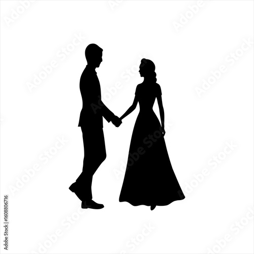 couple, holding hands, silhouette, man, woman, dress, suit, romantic, love, connection, partnership, oneness, togetherness, elegant, classic, black-and-white, simple, clean, graphic, illustration, celebration, event, formal, occasion