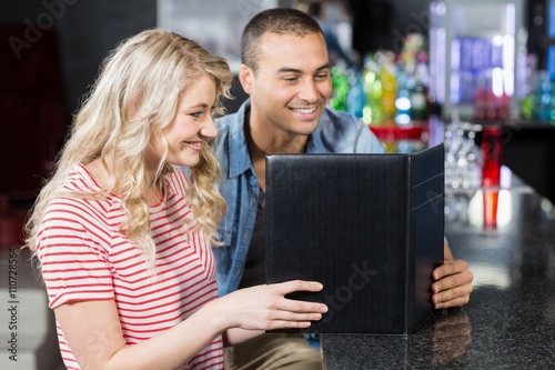 bar, menu, meeting, drink, food, holding, weekend, casual attire, the, human relationships, activity, friendship, caucasian, lifestyle, ethnicity, clothing, industry, client, together, enjoying, smiling, reading, counter, sitting, leisure, female, person, couple, friends, woman, stool, year, woman, young, order, happy, adult, club, male, and, pub, man, man, 20s, mid, fun