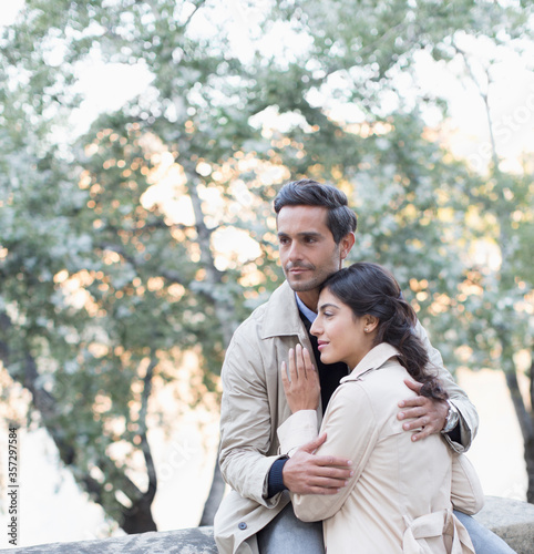 couple, hug, park, adult, affection, bonding, boyfriend, brunette, calm, coat, copy space, day, enjoy, girlfriend, happy, heterosexual, husband, looking away, love, man, mid, nature, outdoors, pair, people, profile, romance, racked, sunny, togetherness, tree, trench, 2, waist up, wife, woman, young