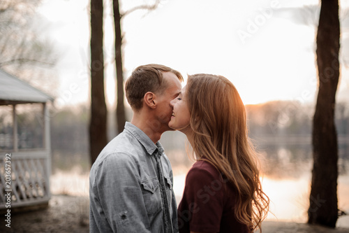 Couple in love standing face to face on the background of lake