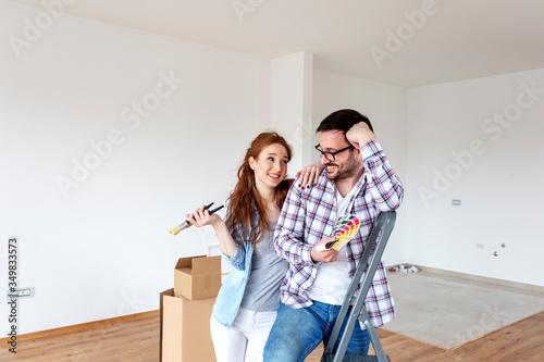 Couple in new house plan how to paint walls and looking at samples of colours with brushes on hand