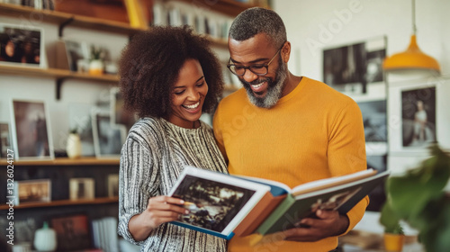 couple, sharing, memory, album, indoor, cosy, smiling, love, happiness, warmth, sitting, reading, together, lifestyle, home, joyful, engagement, photograph, connection, decor, friendship, intimacy, celebration, nostalgia, moment, design, candid, romance, interaction, scene, room, bookshelf, yellow, natural, light, emotion, human relationships, soft, joy, laughter, exploring, comfort, casual attire, enjoying