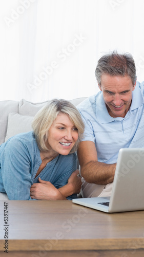 40s, mature adult, woman, female, caucasian, man, male, indoor, home, house, household, homelike, apartment, domicile, abode, couch, sofa, living room, happy, smiling, cheerful, grey hair, blonde hair, fair hair, sitting, leisure, lifestyle, casual attire, couple, human relationships, together, relaxing, content, coffee table, showing, looking, watching, using, laptop, notebook, technology, computer, wireless