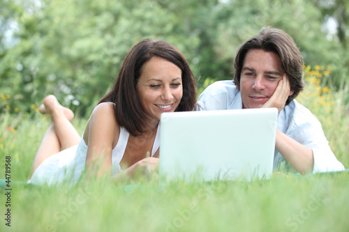 laptop, computer, cyberspace, wi-fi, wireless, webcam, anywhere, connection, connectivity, leisure, reading, watching, viewing, looking, screen, connect, contact, smile, smiling, lying, laying, grass, garden, park, meadow, field, barefoot beach, summer, summer, landscape, outdoors, outside, caucasian, european, relaxed, relaxing