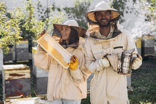 Couple of happy smiling beekeepers working with beekeeping tools near beehive at bee farm