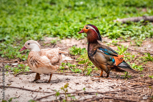 Couple of Mandarin Duck bird on grassy wetlands during a spring nesting period