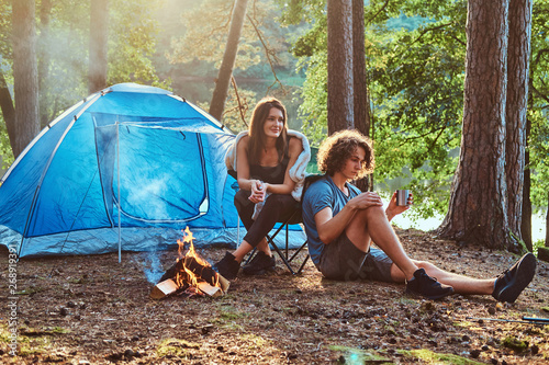 Couple of students are relaxing after long hike in sunny forest.They have tent and bonfire.