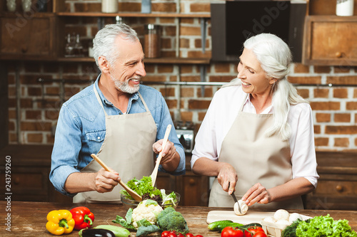 adult, attractive, bearded, beverage, brick wall, caucasian, cook, cooking, couple, day, daylight, daytime, dinner, two together, family, female, food, grey hair, photogenic, happy, healthy, home, husband, indoor, inside, interior, kitchen, leisure, lifestyle, looking, male, man, morning, natural light, people, person, portrait, preparing, salad, senior, table, together, togetherness, two people, vegetable, wife, woman