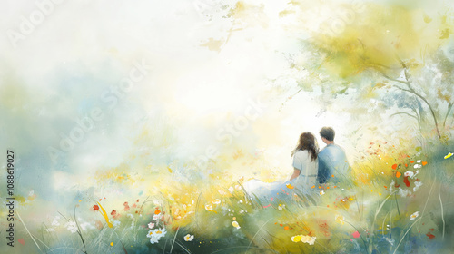 Couple sitting in serene meadow surrounded by wildflowers, bathed in soft sunlight, enjoying peaceful moment of connection and love, symbolizing romance, togetherness, Propose Day celebration