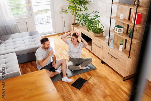 couple, physical exercise, break, relaxation, online, course, fit, fitness, exercise, training, yoga, healthy, lifestyle, home, leisure, athletic, active, young, 2, people, person, indoor, sport, health, stretching, happy, bodycare, exercising, recreation, practice, girl, beautiful, photogenic, woman, man, routine, together, apartment, boyfriend, girlfriend, activewear, laptop, computer, drinking, water, hydrating