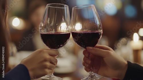 Couple toasting with red wine glasses. Celebratory and intimate restaurant moment. Romantic dining.