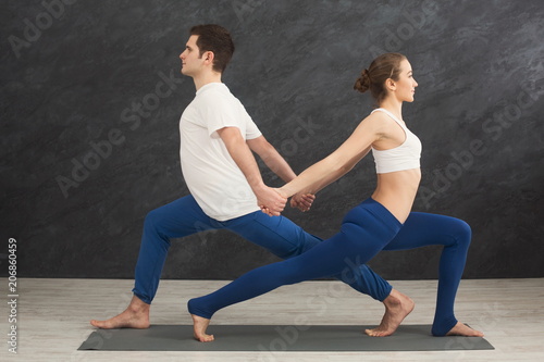 Couple training yoga in balance pose, back to back