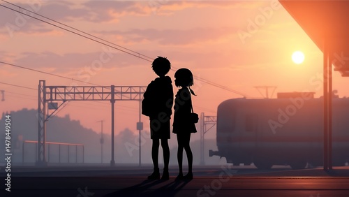 silhouette, anime, couple, boy, girl, waiting, railroad station, platform, train, sunrise, sun, sky, pink, orange, backpack, travel, journey, together, romance, peaceful