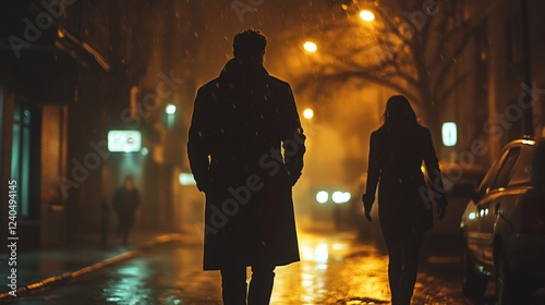stalking, stalker, couple, walking, away, rain, night, city, street, human relationships, breakup, separation, distance, silhouette, dark, light, urban, love, romance, sad, loneliness, heartache, loss, man, woman, people, back, backview, mood, atmosphere, dramatic, cinematic, mystery, suspense, danger, fear, isolation, city lights, reflections, car, building, orange, glow, shadow, contrast