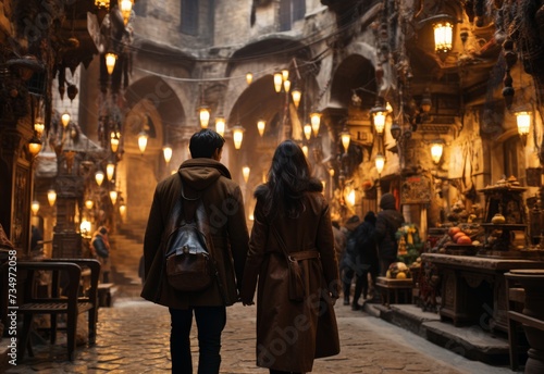 man, woman, couple, walking, street, urban, city, sidewalk, pedestrian, companionship, strolling, tied-up, bustling, daytime, city landscape, building, architecture, people, lifestyle, interaction, conversation, human relationships, companion, journey, exploring, togetherness, pavement, metropolis, teamwork, cooperation, movement, activity