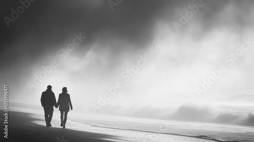 couple, beach, walking, fog, mist, silhouette, sea, ocean, sand, shore, sky, cloud, greyscale, monochrome, stormy, romantic, love, together, hand, in, adventure, travel, journey, horizon, calm, serenity, water, wave, dramatic, peaceful, mood, atmosphere, dark, light, contrast, black, and, white, photo, photo, image, art, nature, landscape