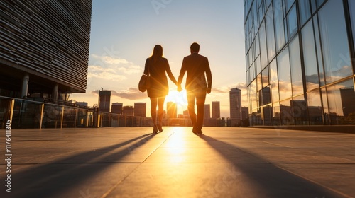Couple walking towards sunset city skyline romantic moment urban environment side view connection and togetherness