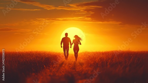 sunset, couple, love, walking, hand, in, field, grass, silhouette, romantic, summer, warm, gold, light, orange, red, sky, horizon, nature, outdoors, together, happiness, human relationships, affection, dreamy, peaceful, beautiful, passion, romance, gentle, warmth, sun, bright, freedom, togetherness, happy, affectionate, intimacy, harmony, serenity, beauty, moment, connection, paradise, bliss, joy