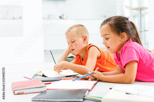 Covid-19 Coronavirus and Learning from home, Home school kid concept. Little children study online learning from home with laptop. Quarantine and Social distancing concept.