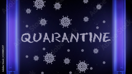 Covid-19 molecules and the word "Quarantine" under UV light. Concept of virus detection