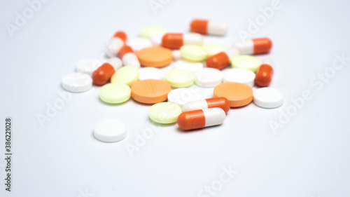 COVID-19. Painkillers tablets close-up on white background.