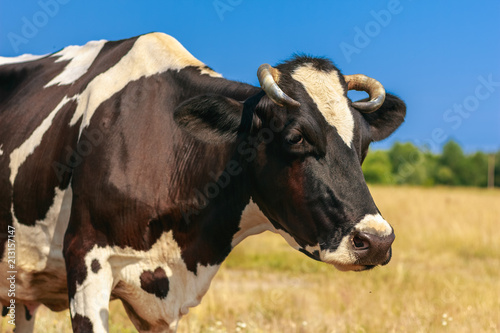 agriculture, animal, beast, beef, black, blue, cattle, cattle breeding, clear sky, closeup, countryside, cow, dairy, day, eating, face, farm, farming, eat, field, grass, graze, grazing, head, heifer, landscape, farm animal, mammal, meadow, milk, muzzle, nature, outdoors, pasture, rural, rural scene, spring, standing, summer, village, white