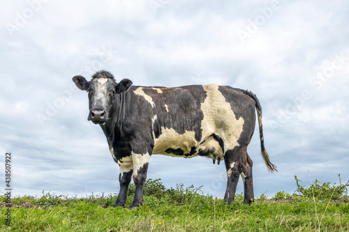 Cow dual purpose, dairy and beef in the Netherlands, standing on green grass in a pasture, at the background a blue sky.