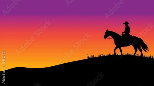 cowboy, horseback, sunset, silhouette, western, landscape, riding, graphic, design, vector, horse, rider, prairie, plain, desert, sky, dusk, evening, wild, west, ranch, farm, rural, nature, outdoors, freedom, adventure, travel, journey, solitude, peace, calm, serene, tranquil, majestic, beautiful, dramatic, colourful, vibrant, background, illustration, image, picture, art, graphic design, banner
