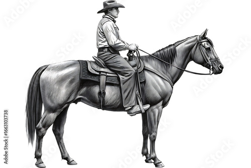 cowboy, horseback, riding, horse, western, man, rider, saddle, bridle, rein, hat, cowboy hat, shirt, pant, boot, stirrup, detailed, illustration, drawing, vignetting, black-and-white, monochrome, vintage, retro, profile, animal, woman, equestrian, brown, ride, outdoors, sport, head, equine, fast horse, dressage, nature, jockey, mammal, mare, horse, competition