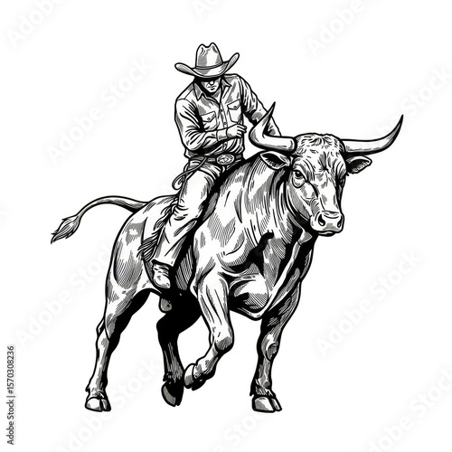 Cowboy Riding Bull Vector Illustration Bucking Outline Transparent Background