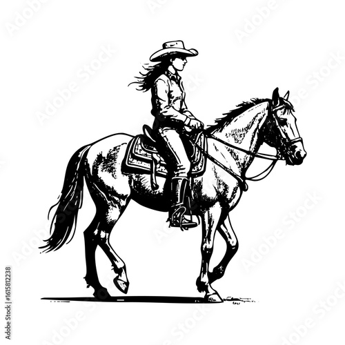 cowgirl, cowboy, woman, female, girl, horse, riding, horseback, hat, desert, arizona, village, rural, saddle, western, ride, jockey, texas, sheriff, mustang, equine, equestrian, engrave, engraved, engraving, woodcut, outline, laser, tattoo, pen, cut, black, white, line, doodle, draw, ink, monochrome, silhouette, colouring, etching, antique, book, retro, vintage, old, art, black-and-white, vignetting