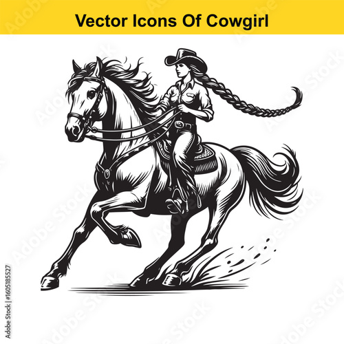 Cowgirl Riding Horse with Braid and Blowing Hat – Western Line Art Vector
