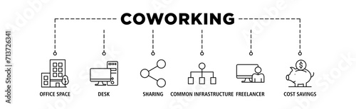 Coworking banner web icon set vector illustration concept with icon of office space, desk, sharing, common infrastructure, freelancer, and cost savings