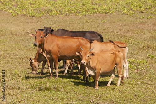 cow, several, grass, green, graze, pasture, browse, agriculture, animal, beef, bull, eat, farm, farming, field, island, siam
