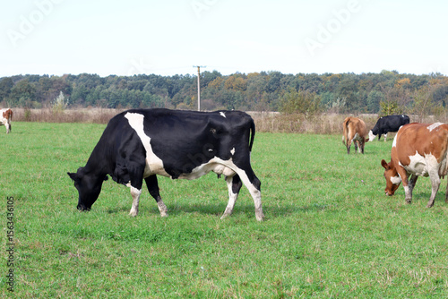 Cows graze in the pasture. Agriculture. Cattle breeding.