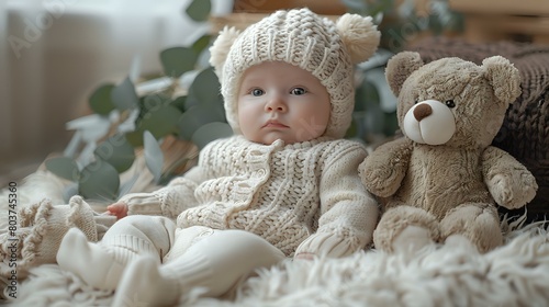 Cozy Affection: Infant Bodysuit and Teddy Bear in Warm, Soft Textures