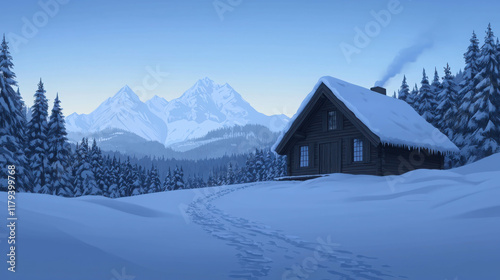 Cozy Alpine Chalet Surrounded by Snow-Covered Mountains at Dawn