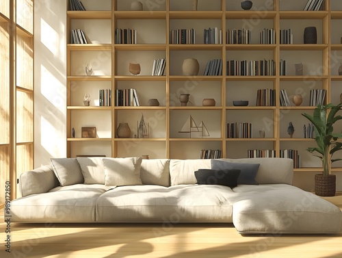 Cozy and inviting modern living room with a large comfortable sectional sofa minimalist stylish decor floor to ceiling bookshelves with decorative objects clean lines
