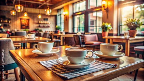 Cozy atmosphere of empty cafe with table set for three, cups, saucers, and napkins, conveying friendship and social bonding scene.